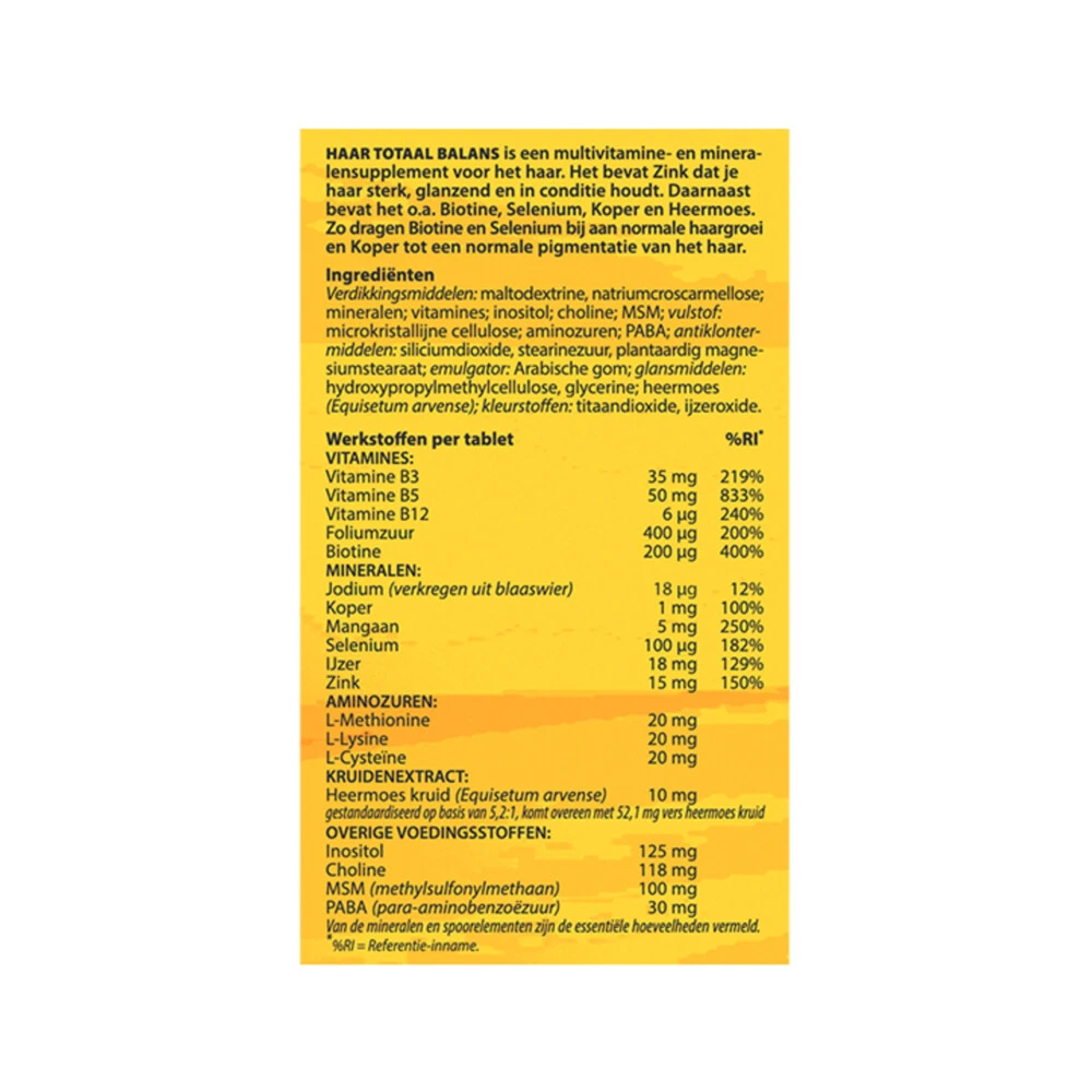 Haarformule*Bloem Haar Totaal Balans nr. 644 bestaat uit vitaminen, kruiden, mineralen en aminozuren die een positieve invloed hebben op het haar. Biotine en selenium dragen bij aan de normale haargroei. Zink zorgt voor sterk haar en het behoud van glanzend haar. Koper is verantwoordelijk voor normale pigmentatie van het haar.Haarformule draagt bij aan een normale haargroei (Biotine en Selenium)Houdt je haren sterk (zink)Voor het behoud van glanzend haar (zink)Draagt bij tot een normale pigmenta