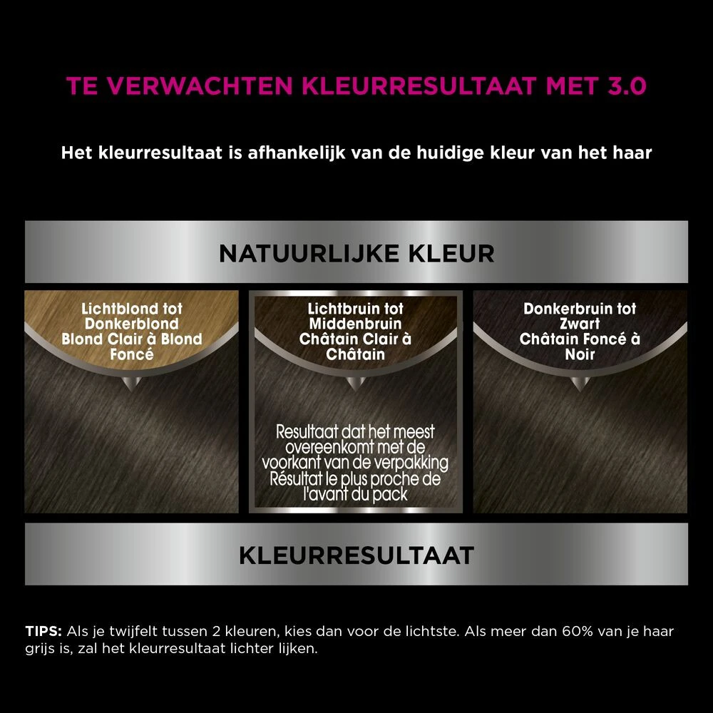Garnier Olia 3.0 Donkerbruin Haarkleuring:- Intense, levendige en langhoudende kleur- Zichtbaar verbeterde haarkwaliteit, kleur na kleur- 3x Glanzender haar**- 35% zachter haar**- Zonder ammoniak voor een aangename geur- Tot 100% GrijsdekkingErvaar nu de kracht van pure oliën met Garnier Olia!De permanente thuiskleuring met 100% grijsdekking op basis van 60% oliën* geeft het haar een intense kleur, een schitterende glans, en zichtbaar verbeterde haarkwaliteit, kleur na k